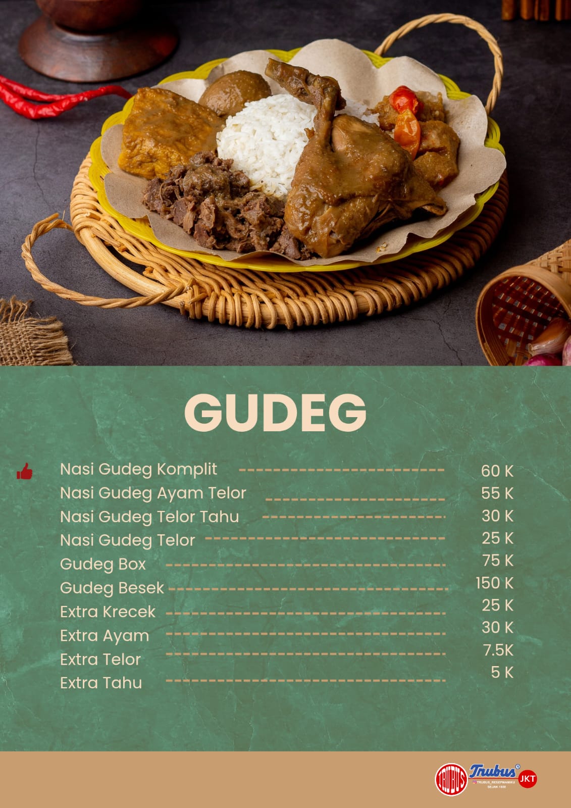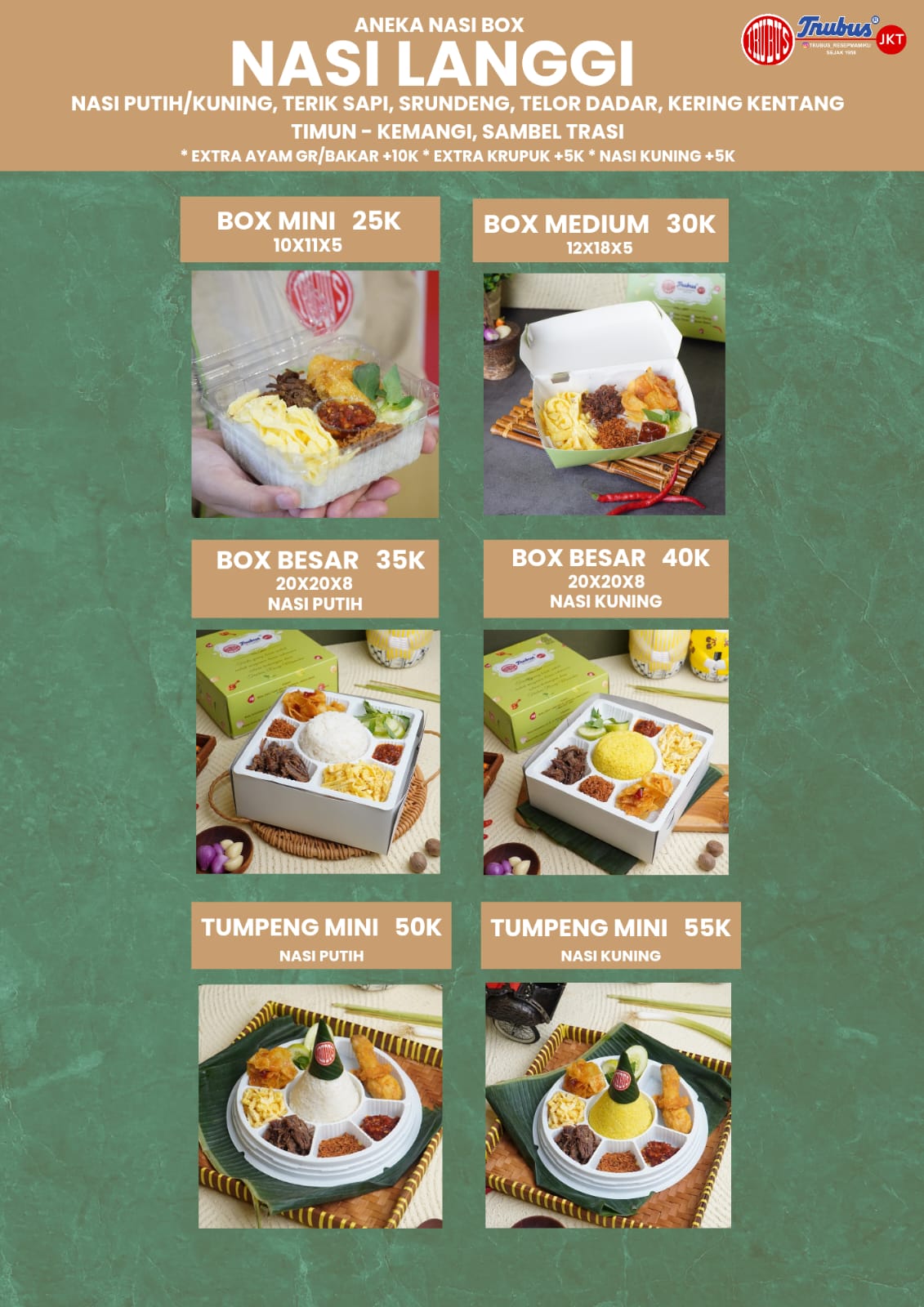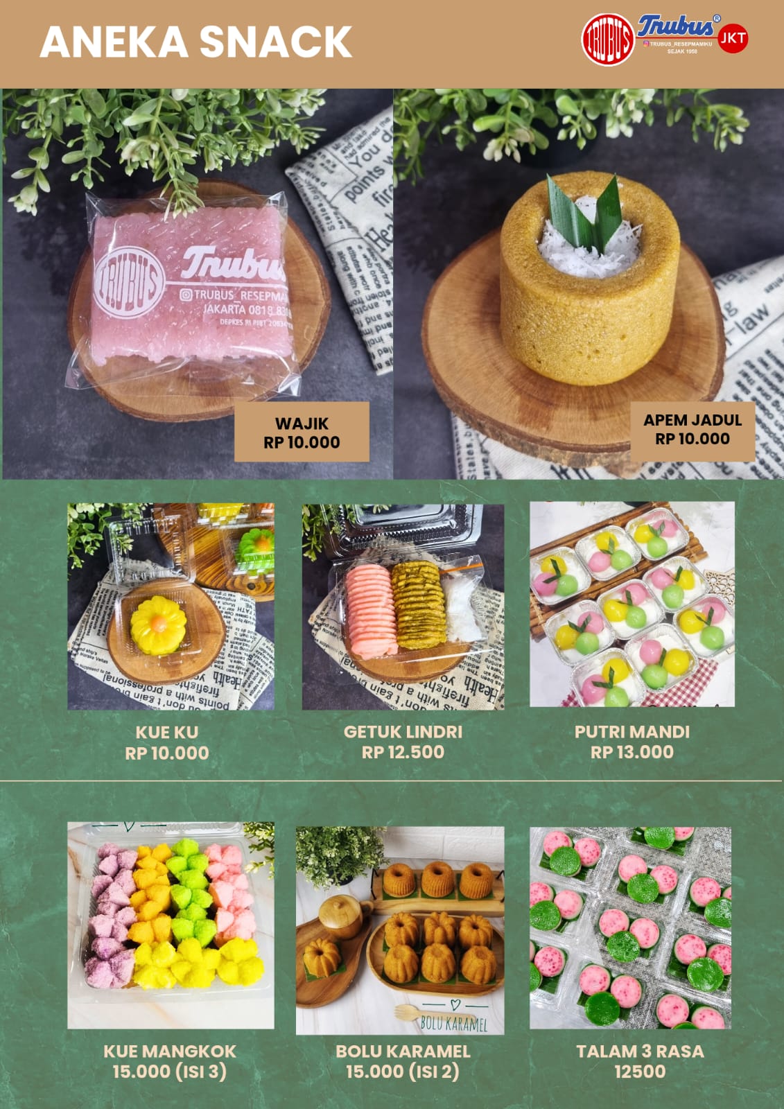Kisah kami bermula di Yogyakarta pada tahun 1958. Trubus bukan sekadar makanan, tapi sebuah perjalanan waktu. Dulu, aneka kue dan jajan pasar kami digendong keliling kota Jogja oleh Simbok-simbok menggunakan “Tenong”.