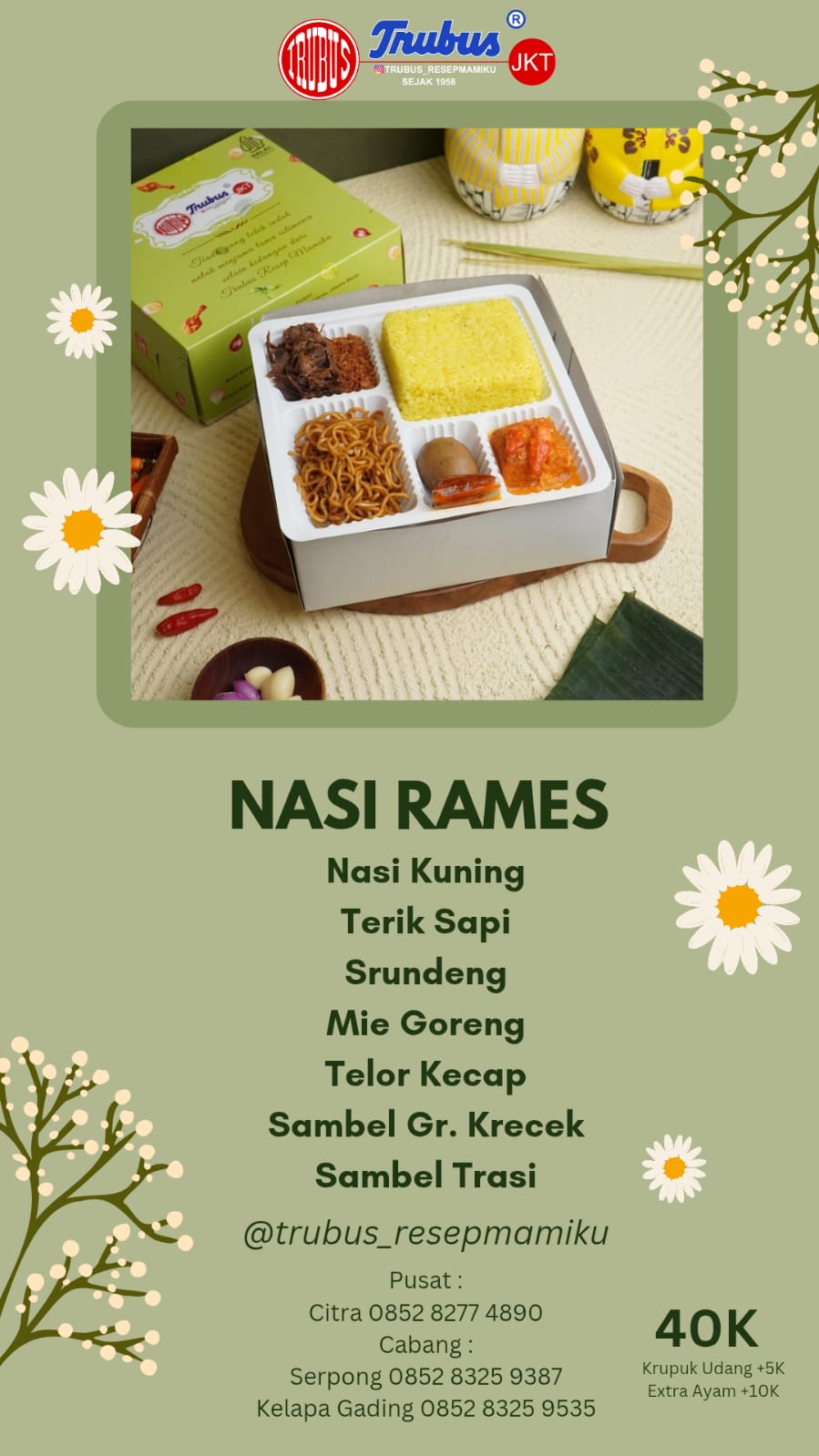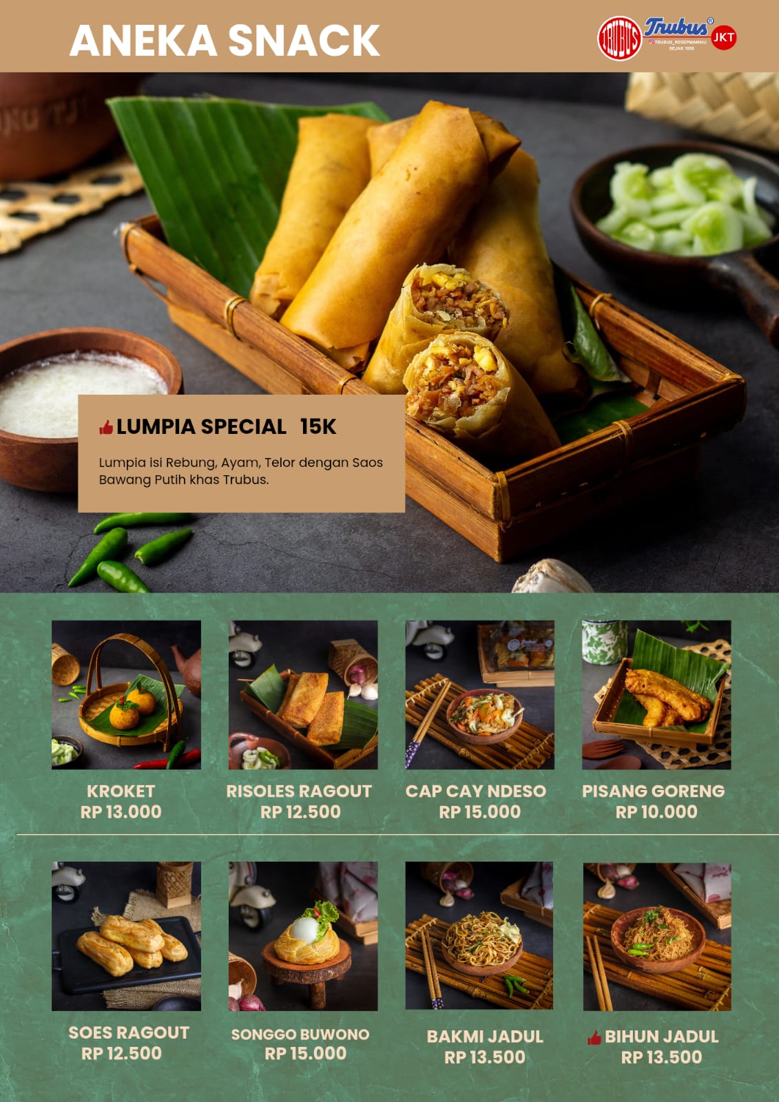 SUGENG RAWUH Trubus adalah makanan legendaris dari Yogyakarta yang sudah berdiri sejak 1958. Berawal dari jajan pasar seperti lumpia, Risoles, Bihun Jadul dll yang digendong memakai Tenong oleh simbok-simbok keliling kota Yogyakarta